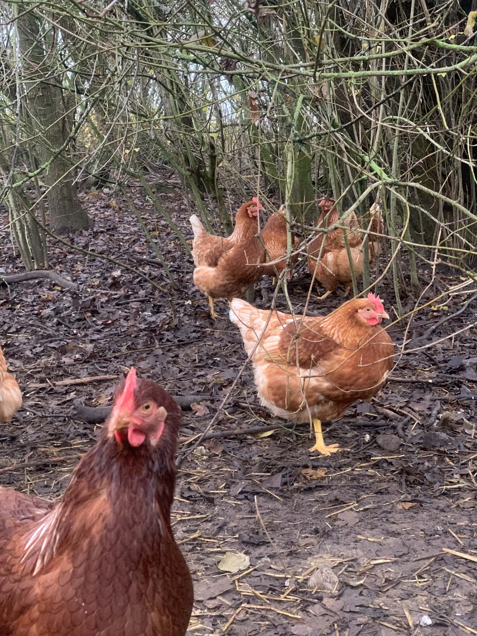 Vores økologiske æglæggere bor i mobile hønsehuse som vi jævnligt flytter rundt til frisk græs sommeren igennem. Om efteråret parkerer vi hønsehusene og laver en vinterindhegning som enten er overdækket af net eller under træer. Efterhånden som hønsene har spist alt græsset i den permanente vinterfold, sørger vi for, at de får overskudsgrønt fra vores markedshave eller wraphø.